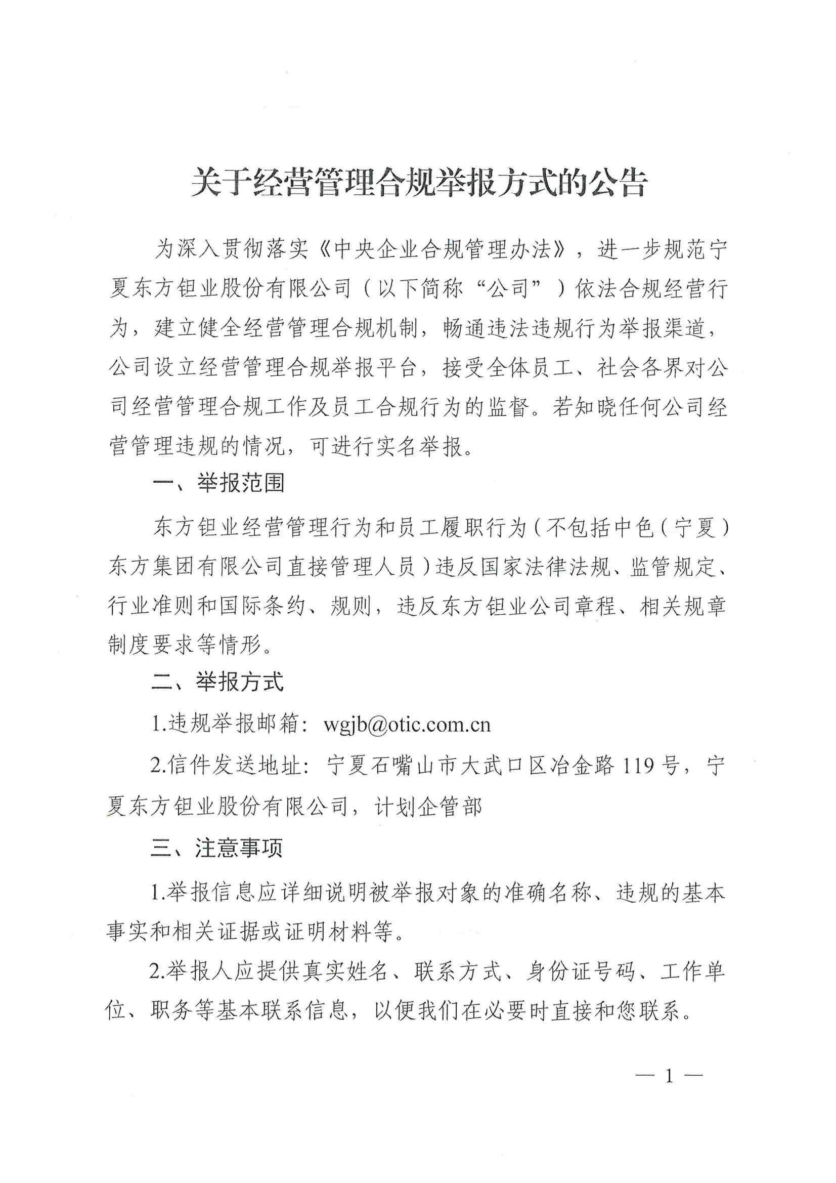 关于经营管理合规举报方式的公告